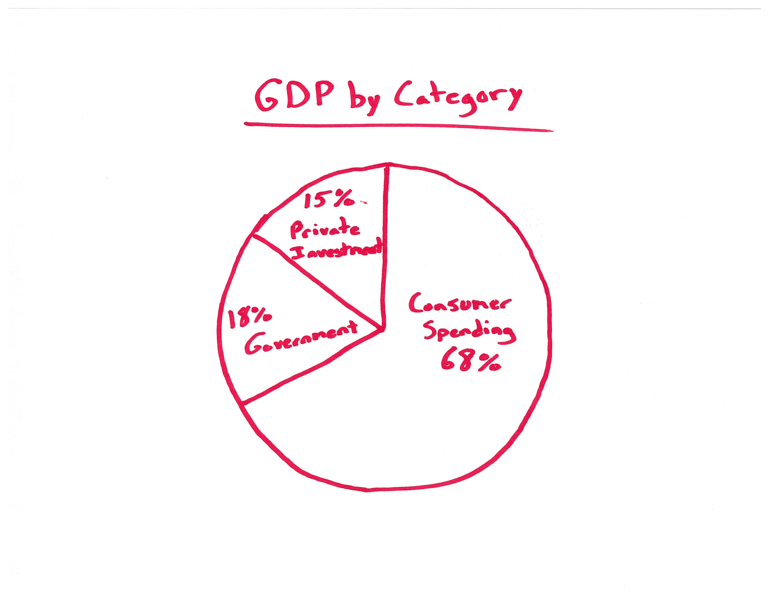 The GDP of the United States is made up primarily of 3 categories – Government spending, corporate spending/private investment, and consumer spending.